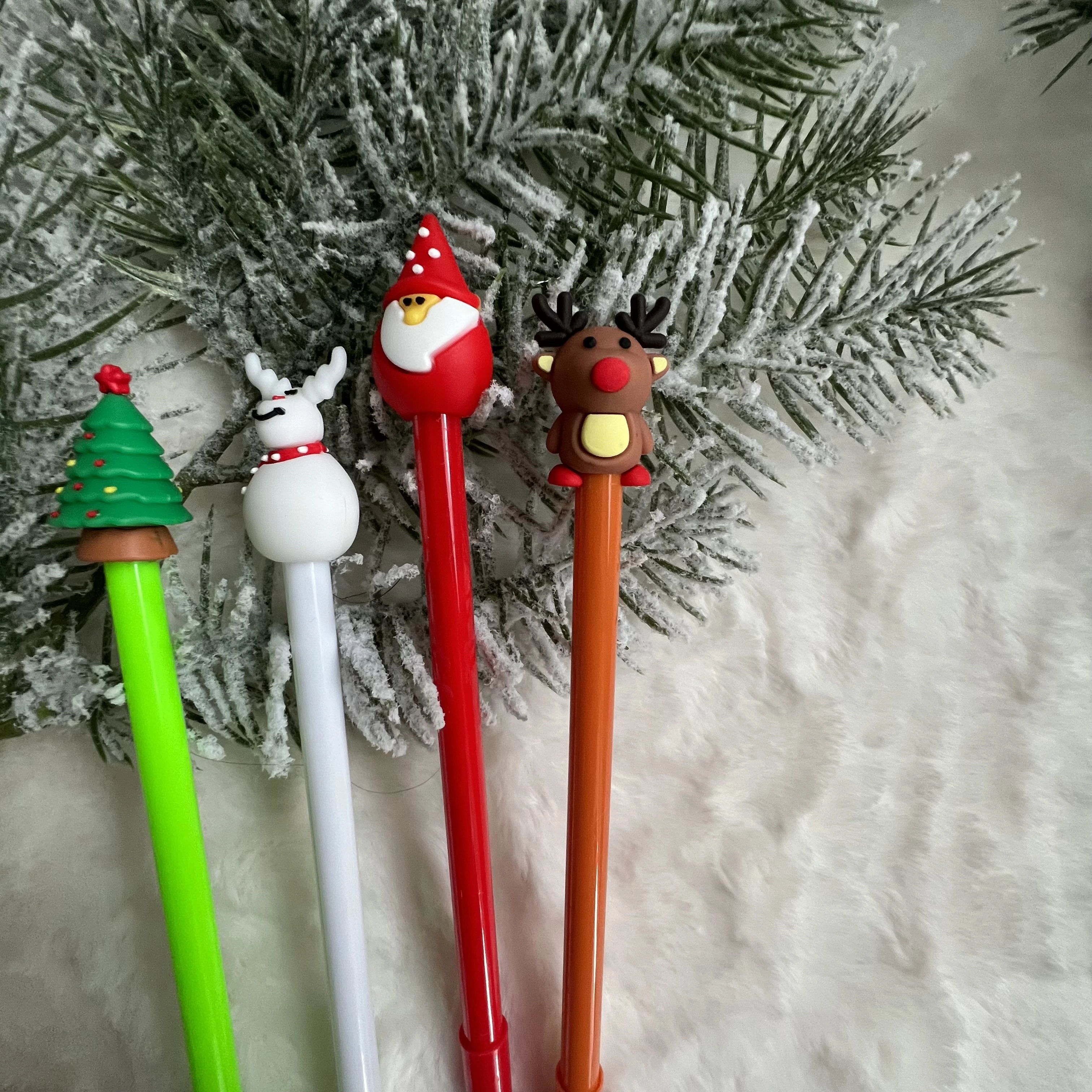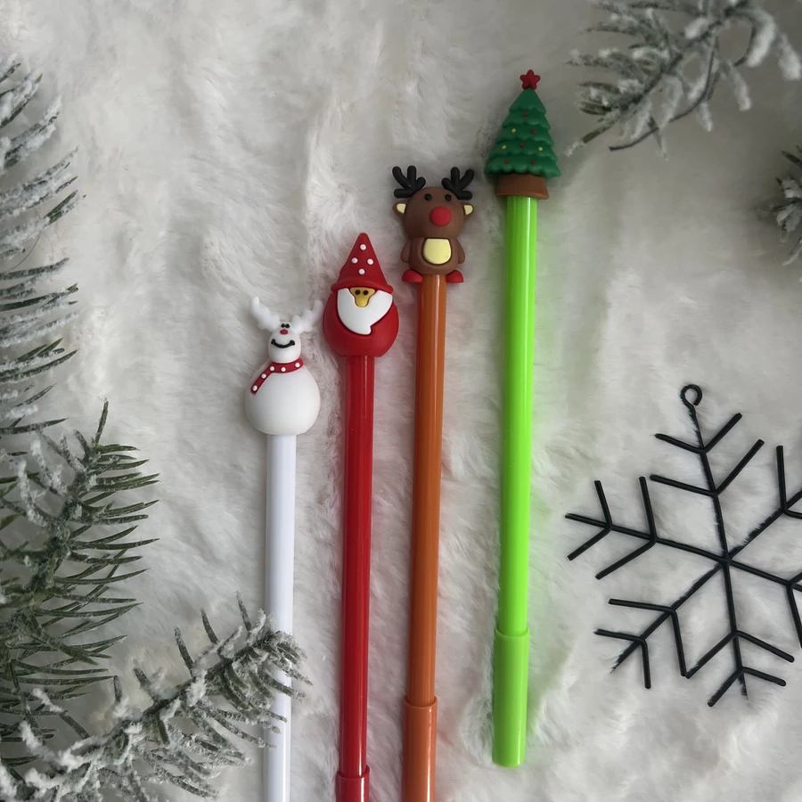 Vidám karácsonyi toll műanyag borítással és ünnepi figurákkal – Mikulás, rénszarvas, hóember, karácsonyfa. Remek apróság mikuláscsomagba gyerekeknek, iskolai vagy óvodai ajándéknak.
